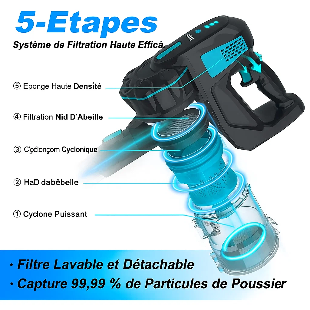Cet aspirateur-balai sans fil 6-en-1 combine une puissance d’aspiration de 20 KPa avec un design ultra-léger de 1,6 kg, offrant des performances professionnelles dans toute la maison — cuisine, escaliers, voiture, zones pour animaux — sans le bruit ni l’encombrement des aspirateurs traditionnels.