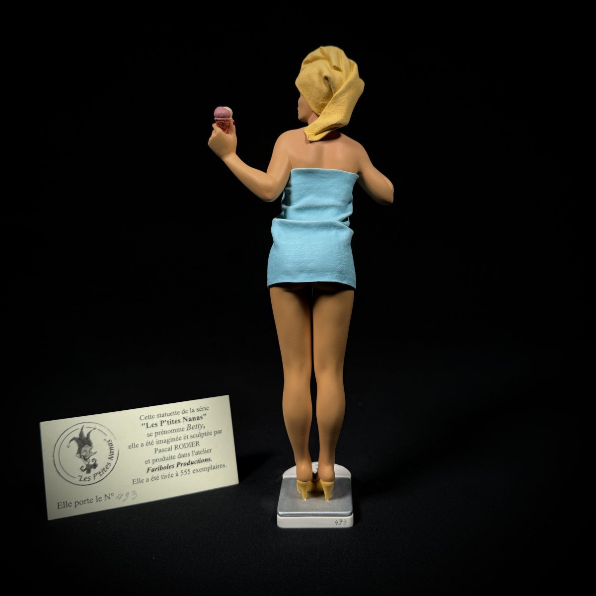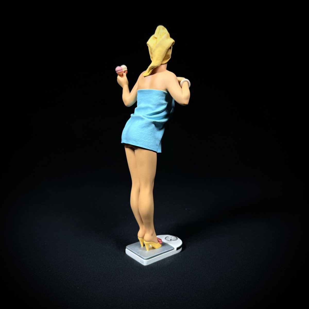 Mais là, j’ai un peu l’impression qu’elle ne s’attendait pas à être prise sur le fait, les doigts dans le pot de confiture ou plutôt, autour du cornet de glace. Cependant, ne cherchez pas de chiffre précis sur le cadrant du pèse personne : par galanterie, nous n’avons pas souhaité que son poids apparaisse.