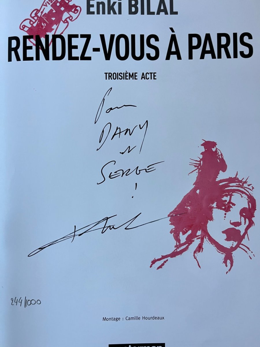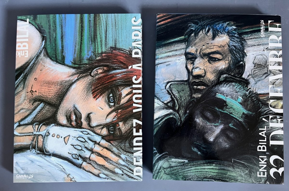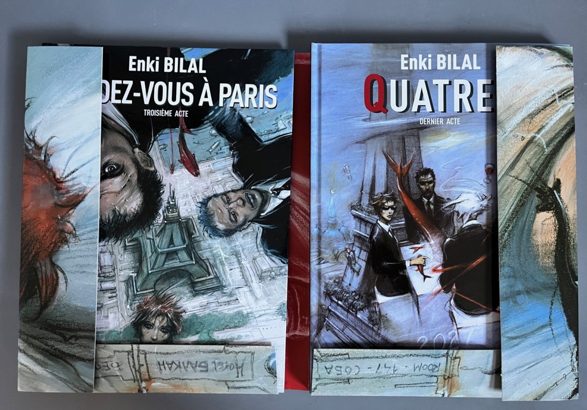 -Rendez-vous à Paris qui contient les albums Rendez-vous à Paris et Quatre – Avec son cartonnage d’origine signé par Bilal – Les deux albums sont signés en page de titre – Chaque album comprend en outre un calque tirage limité