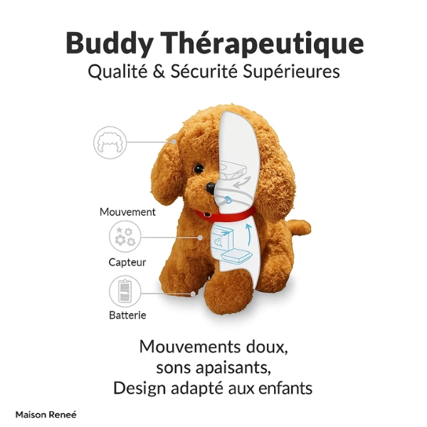 Buddy offre une interaction simple et répétitive : caresses douces, réponse sensorielle et sons apaisants.