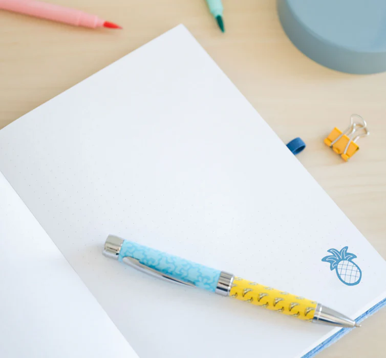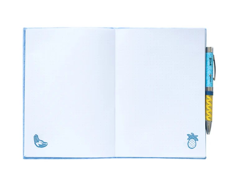 - Cahier A5. Il est doté d’une couverture pelliculée mate, d’un intérieur personnalisé, de coins arrondis et d’une reliure collée.