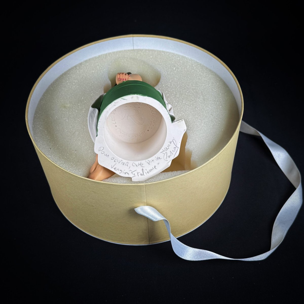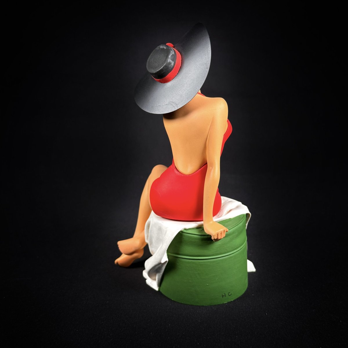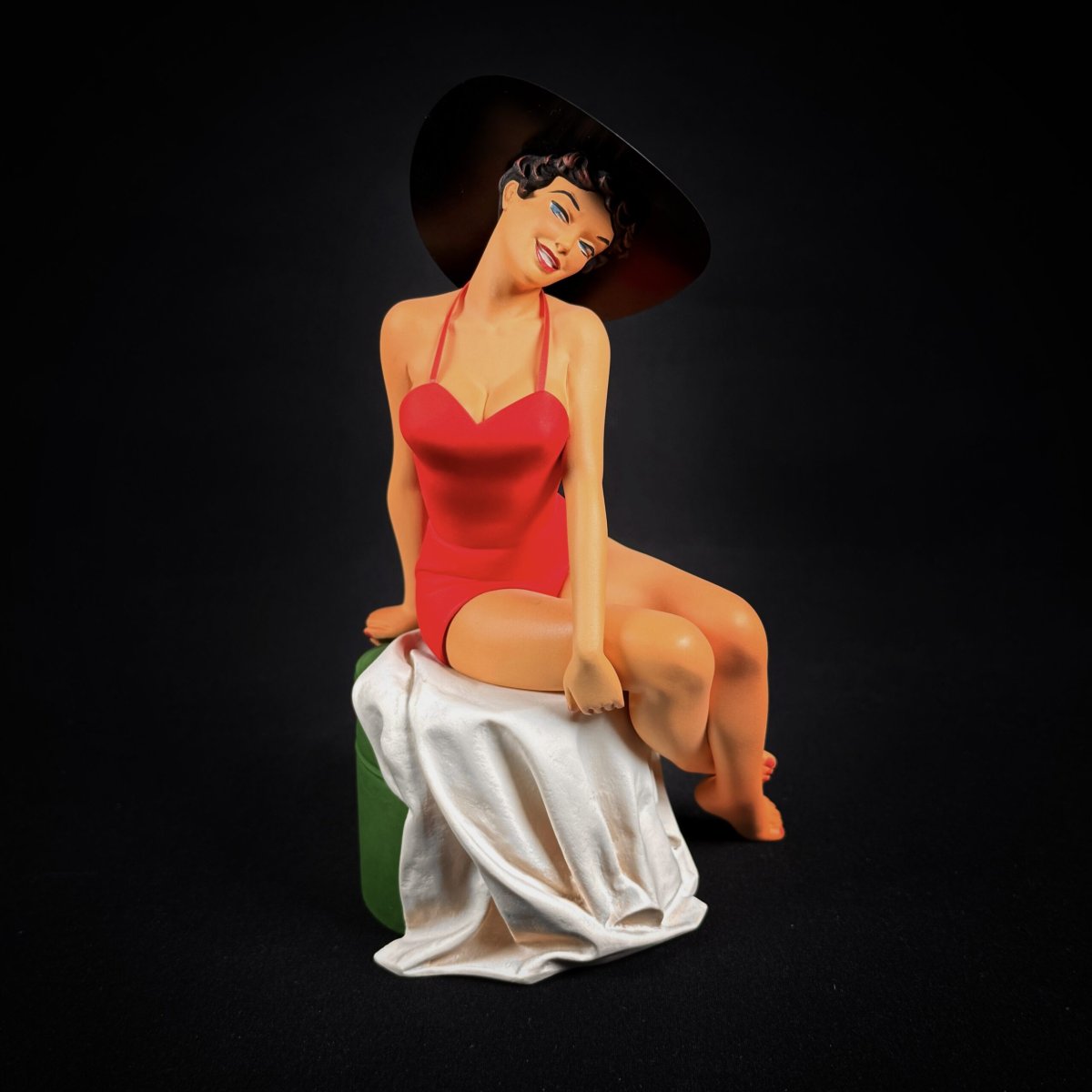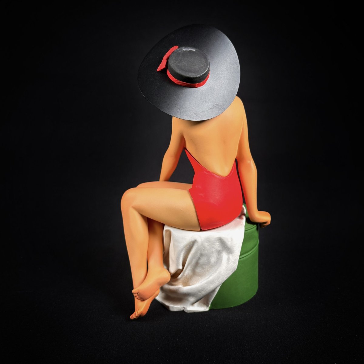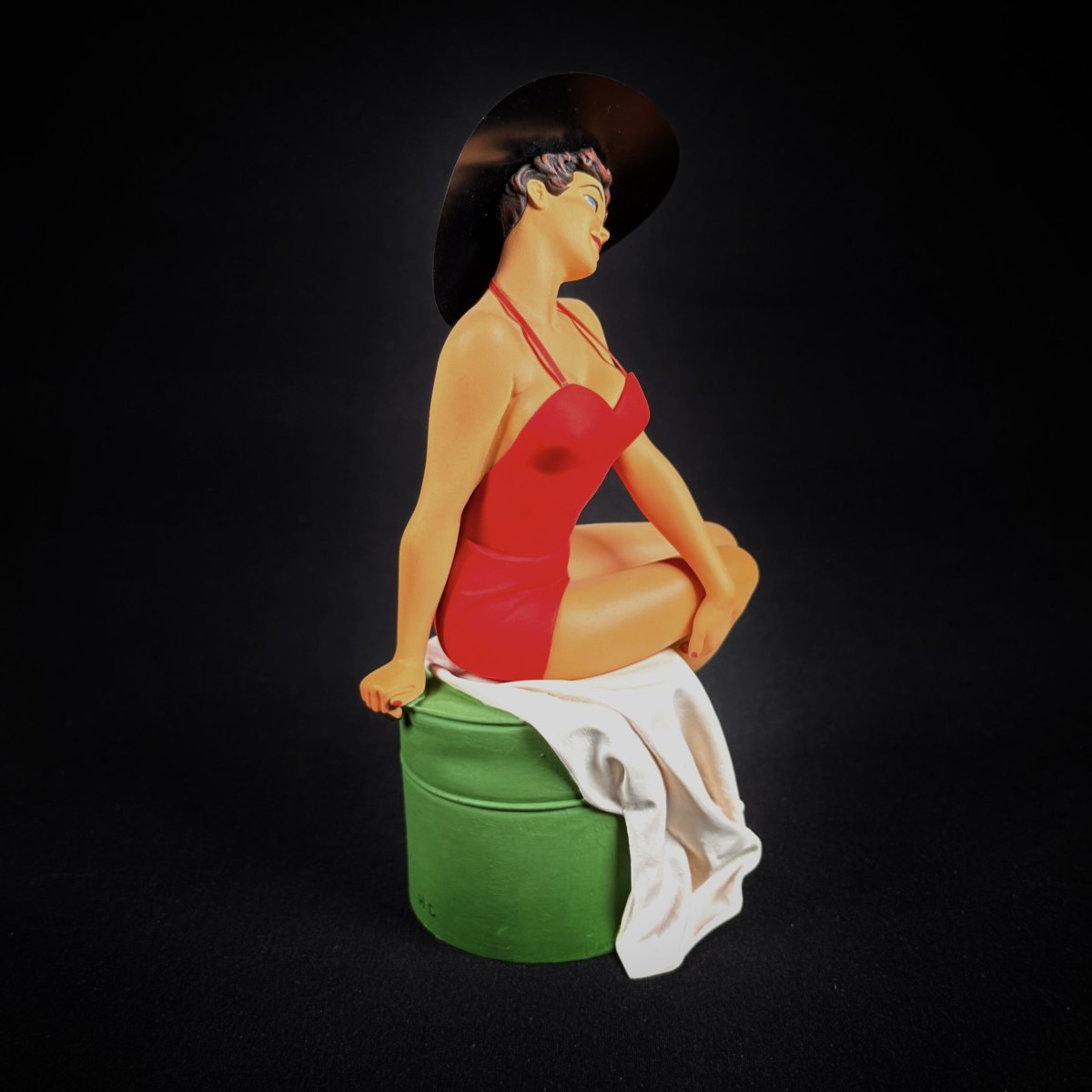 Ça fait vieux con, hein, ce discours ? Surtout que cette époque bénie et révolue, je ne l’ai pas vraiment connue (j’avais 6 ans en 68 quand les vraies jeunes filles ce sont mise à faire de la politique !) Allez trêve de propos stupides : j’ai juste cherché à faire plaisir avec cette statuette. C’est une création personnelle ; la première, je l’espère, d’une série de p’tites nanas dans le même esprit. Celle-ci est présentée dans un joli carton à chapeaux. Sur la plage abandonnée…. coquillages et crustacés… »