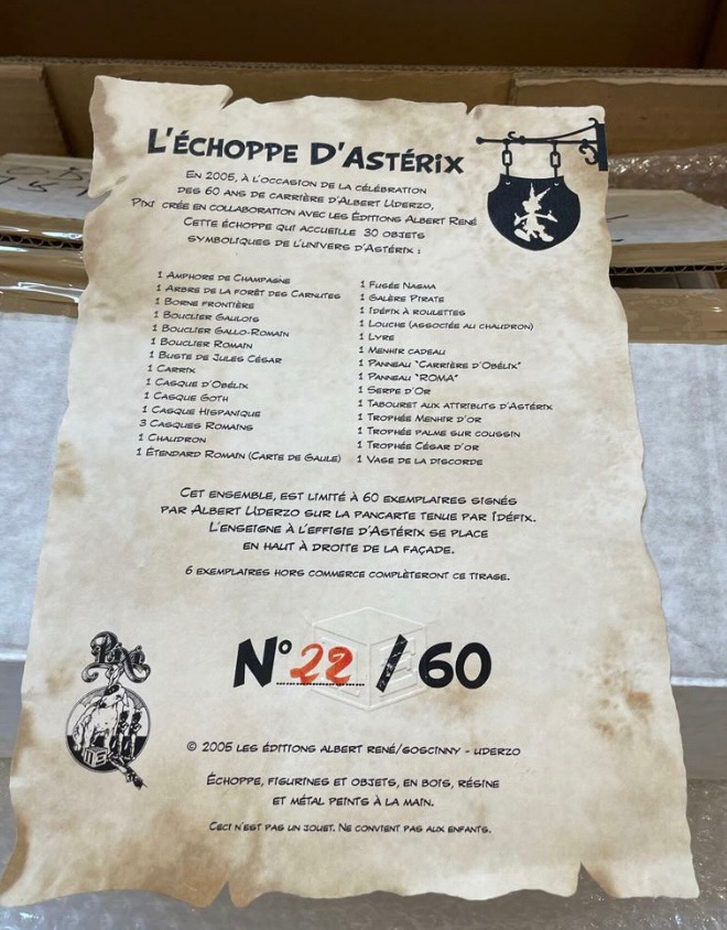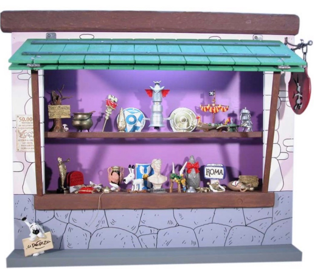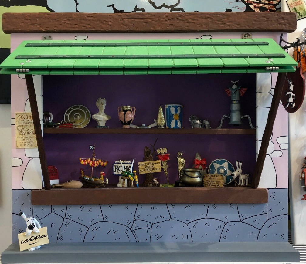 L’échoppe d’Asterix – Complète avec ses 30 objets symboliques des aventures de nos Gaulois – Eclairage intégré – Référence 6031 – Pixi – Collection Uderzo – Les objets du mythe – Pièce anniversaire réalisée à l’occasion des 60 ans de carrière d’Albert Goscinny – L’ensemble a été réalisé d’après des illustrations originales de Goscinny – (2006)