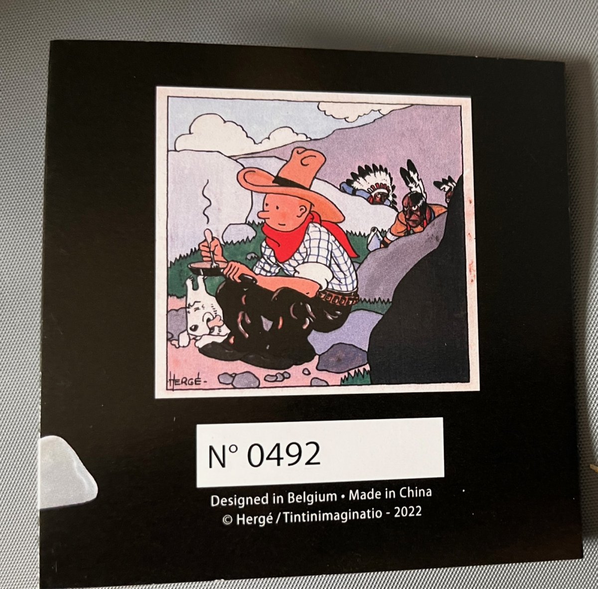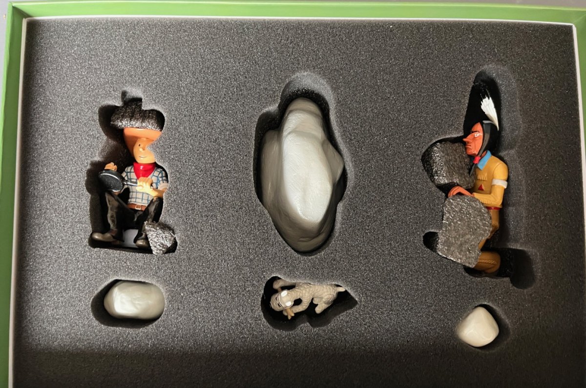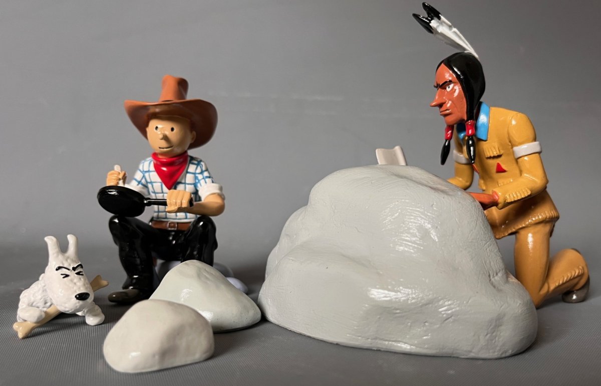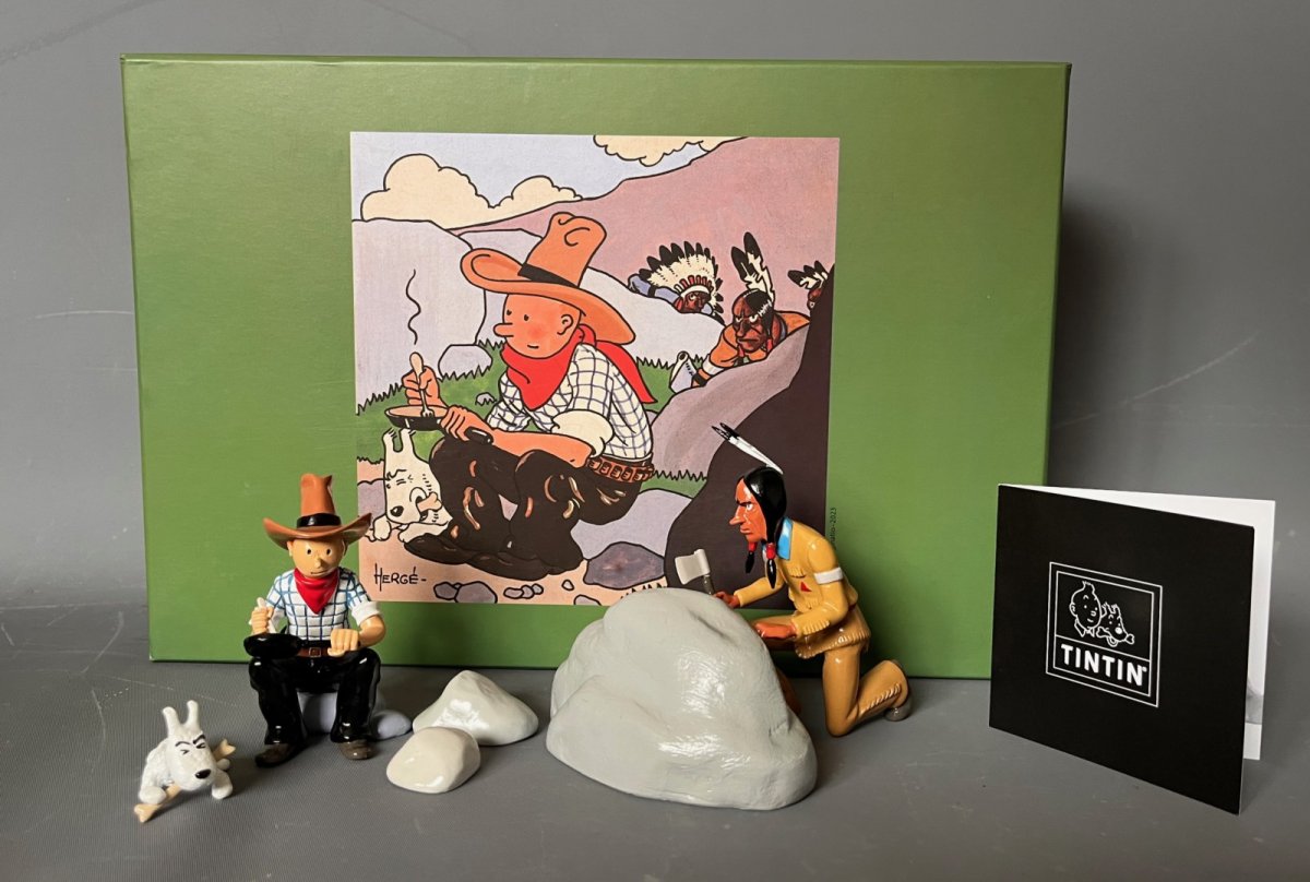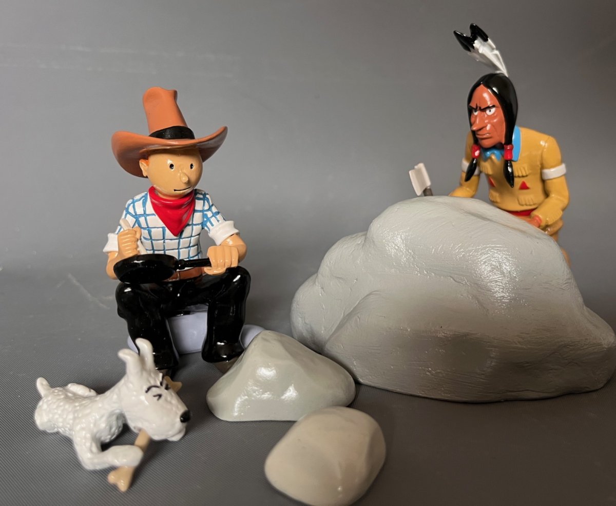 La scène comporte: Tintin (9 cm) – Milou (3 cm), L’indien (10cm) et 3 rochers indépendants – Alliage métal et polyrésine – Figurines peintes à la main