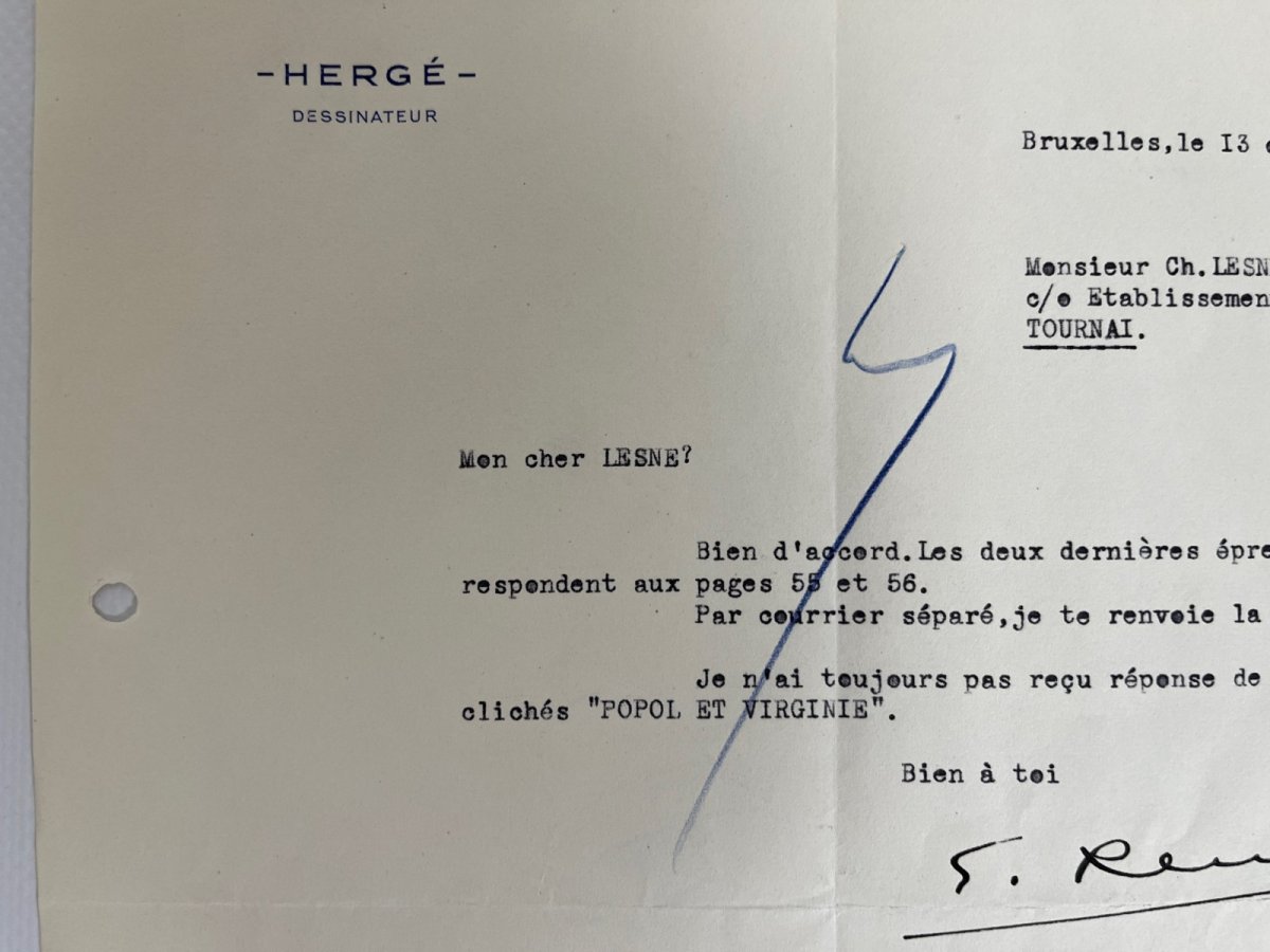 La lettre est adressée à Mr Charles Lesne, des établissements Casterman à Tournai – Prédécesseur de Louis Robert Casterman, ami et correspondant d’Hergé Aix établissements Casterman – Mr Lesne fut notamment impliqué dans les choix pour la parution de Tintin en Amérique
