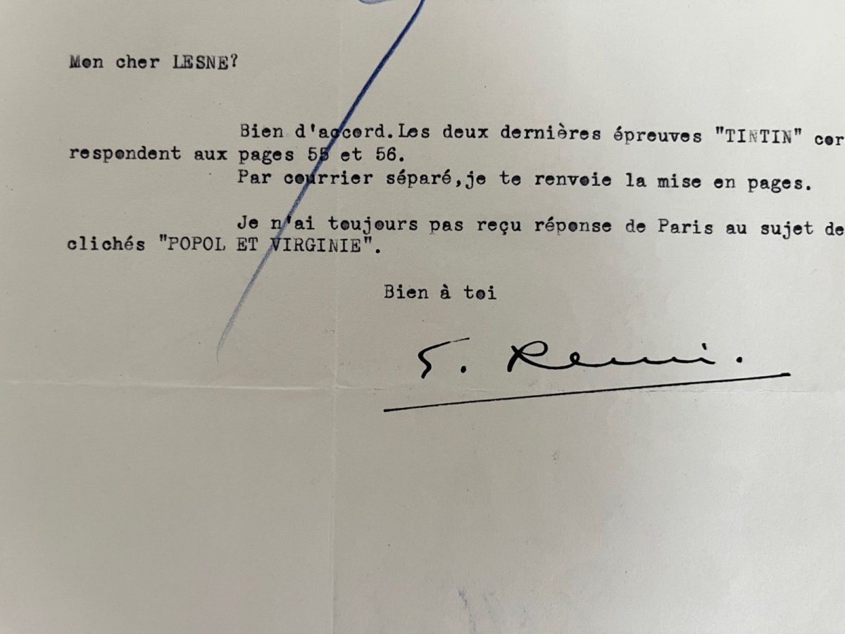 Datée du 13 octobre 1938 – Elle a pour sujet la mise en page d’un futur album Tintin ainsi que des clichés Popol et Virginie
