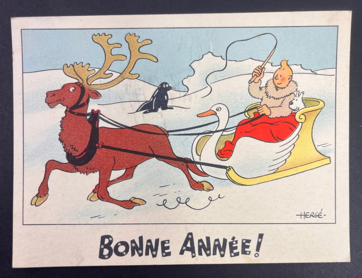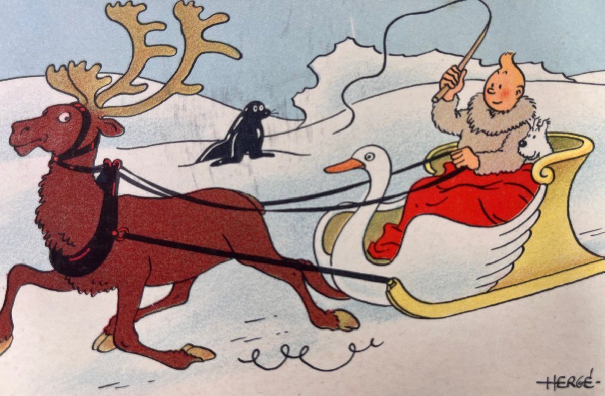 Hergé – Carte neige – Tintin et Milou sur un traineau en forme de cygne tiré par un renne – Casterman – (1942)