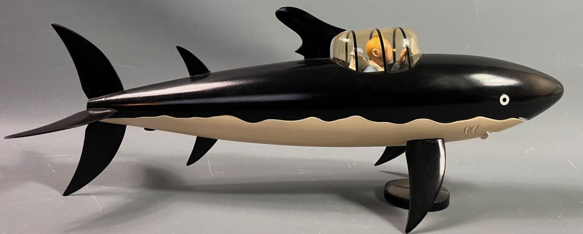 Inspiré des Aventures de Tintin, Le trésor de Rackham le Rouge – Requin de Michell Aroutcheff et personnages de Patrick Regout – Bois, résine et métal – Personnages en résine – Longueur 47 cm – Ventre du requin blanc écru