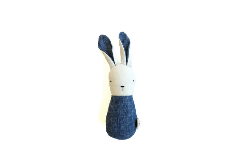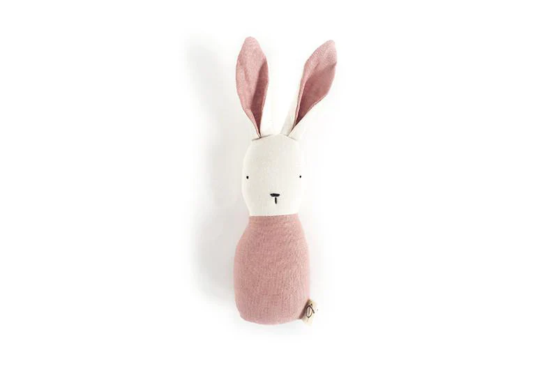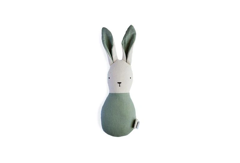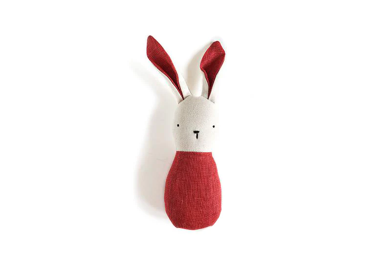 Parfait compagnon pour le jeu ou la sieste, cette version estivale de nos lapins hochets est faite à la main à partir de lin et/ou coton réutilisés et rembourré de laine cardée naturelle.
