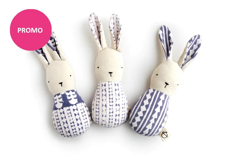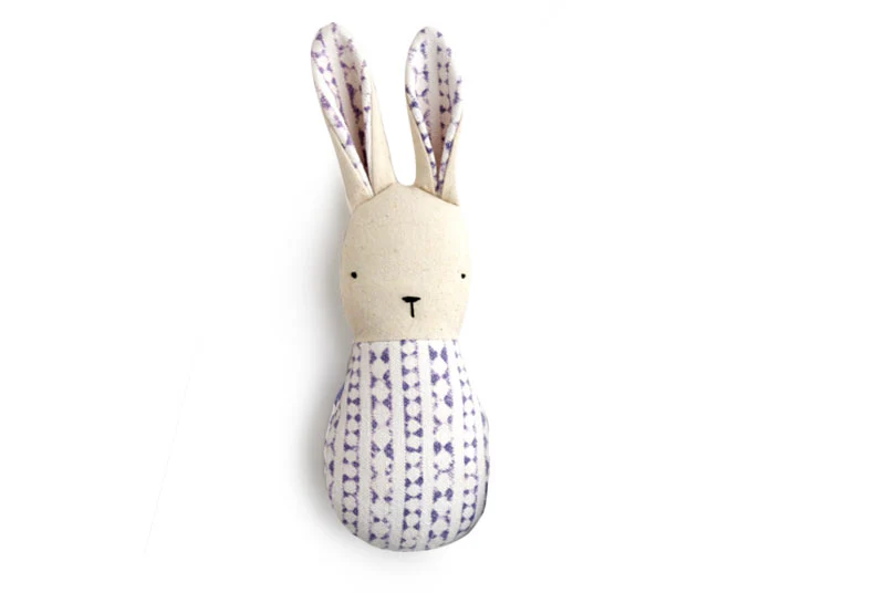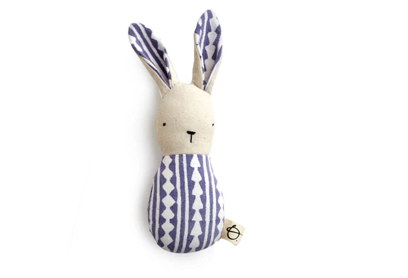 Parfait compagnon pour le jeu ou la sieste, notre lapin hochet est fait à la main à partir de lin et/ou coton réutilisés et rembourré de laine cardée naturelle.
