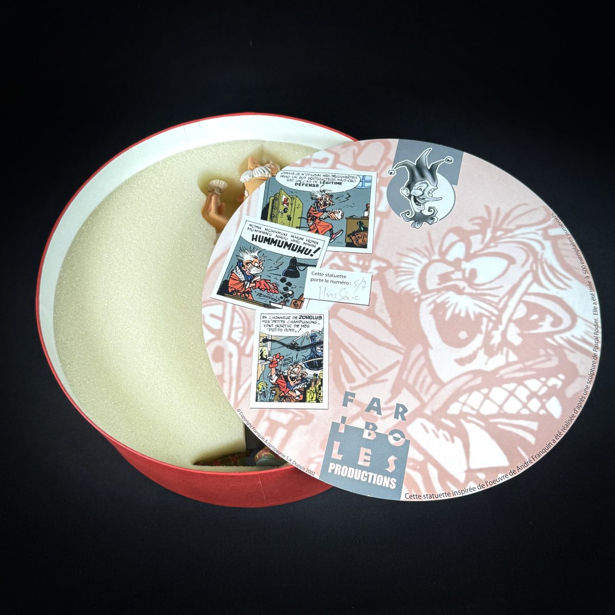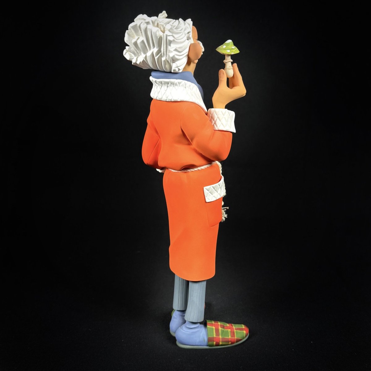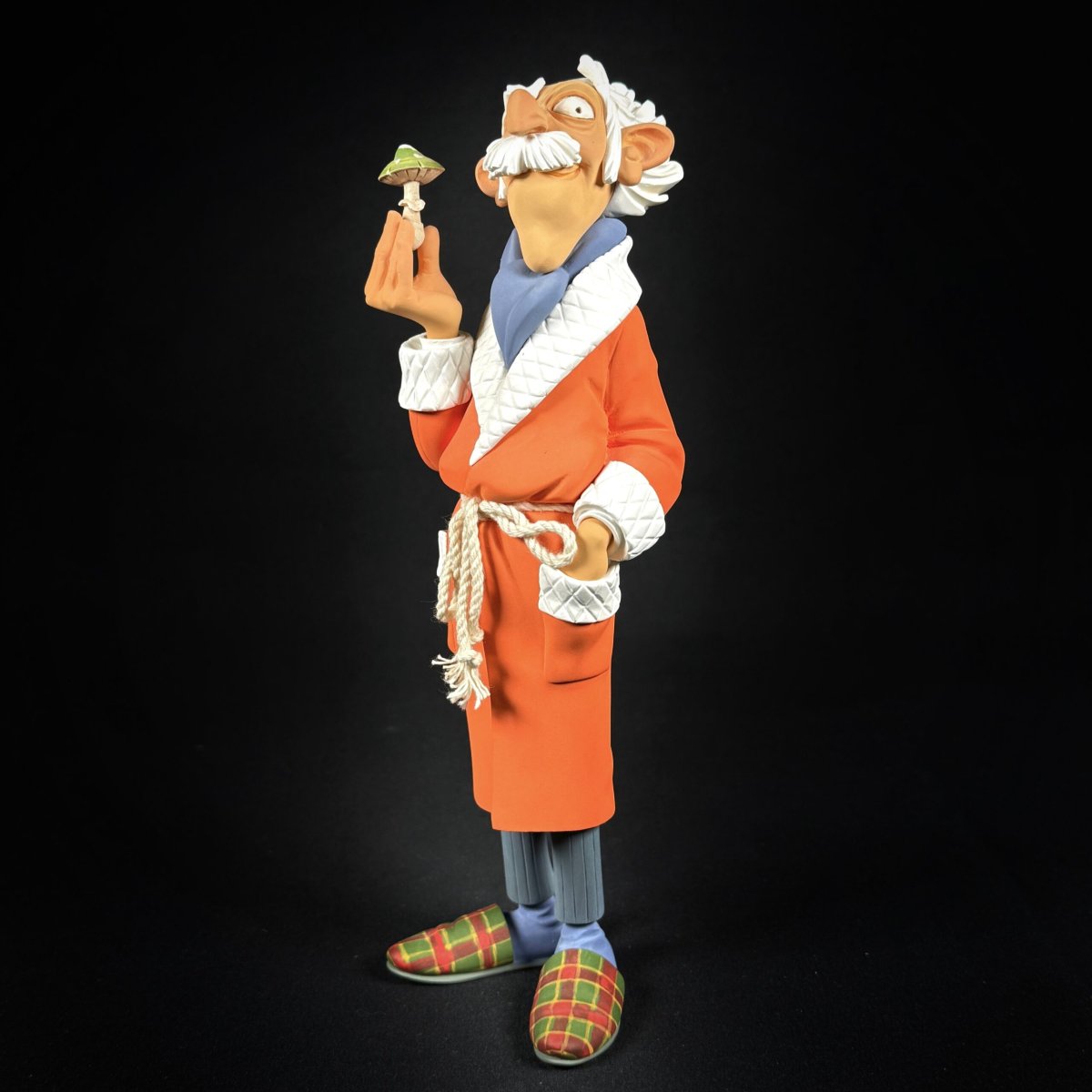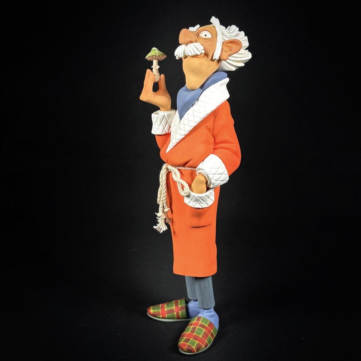 Je n’ai pas voulu reproduire fidèlement une case particulière, mais j’ai préféré restituer dans l’attitude de cette statuette l’expression malicieuse (et peut être un peu vicelarde, j’en conviens…) qu’un vieux savant fou se doit d’avoir lorsque on lui chauffe un peu trop les oreilles.