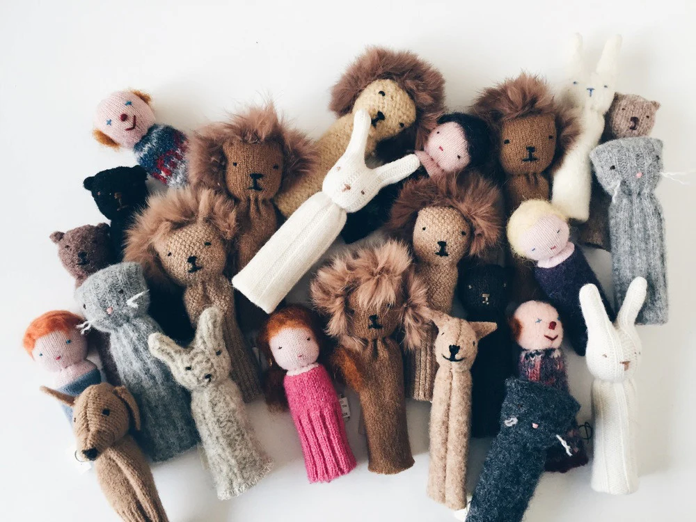 Parfaits compagnons pour encourager votre imaginaire et vous accompagner dans de nombreuses histoires, nos marionnettes à doigt sont faites à la main à partir de retailles de chandails en pure laine récupérés et bourrées de laine cardée naturelle.
