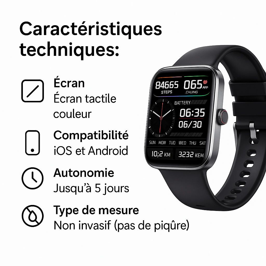 Prenez soin de votre bien-être avec GlucoWatch, une montre innovante conçue pour vous offrir un suivi complet de votre santé. Parfaite pour tous ceux qui souhaitent suivre leur condition physique de manière facile et confortable, elle vous permet de surveiller en temps réel votre fréquence cardiaque, votre tension artérielle, votre niveau d’oxygène sanguin, ainsi que la qualité de votre sommeil.