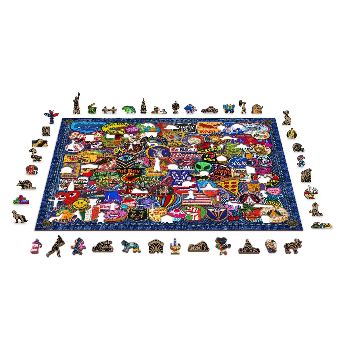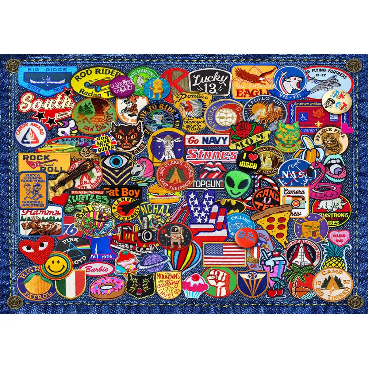 Le Patch Crazy 1000 vous invite à embarquer dans un voyage captivant, assemblant l’image fascinante d’une poche en denim ornée de multiples patchs de différents styles.