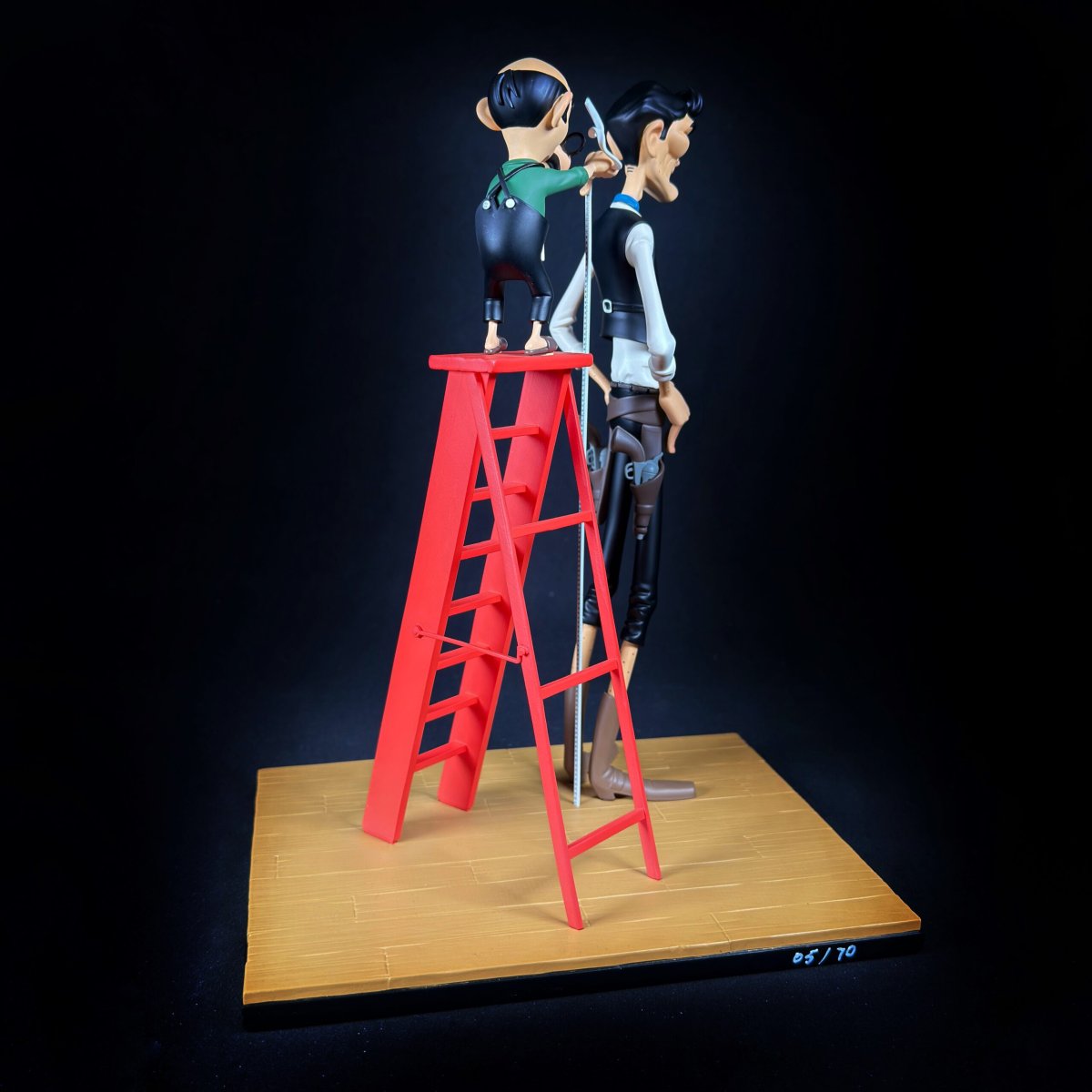 C’est pour mettre en évidence la taille impressionnante de ce personnage, auquel Morris prête les traits de l’acteur Jack Palance, que nous avons choisi de représenter cette séquence. Contraste assuré entre le tailleur minuscule obligé de grimper sur un escabeau pour prendre les mesures et la terreur Phil Defer.