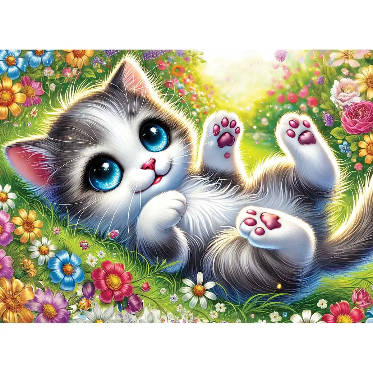 Chaque détail de ce modèle respire la tendresse. Le chaton, entouré de fleurs, semble vivre un moment de calme parfait. L’image entière invite à la détente et au sourire.