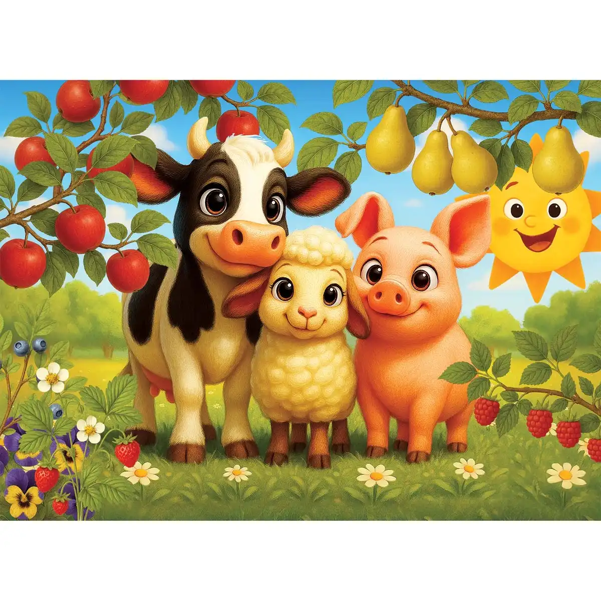 Le Puzzle en bois 40 Les Animaux du Verger raconte une histoire d’amitié, de paix et de nature. Chaque pièce s’ajuste parfaitement, révélant une image lumineuse et apaisante. La vache, calme et bienveillante, se tient au centre, entourée de ses amis. Autour d’eux, des pommes rouges pendent des arbres et des fleurs colorent le sol. L’ensemble respire la sérénité et la chaleur.