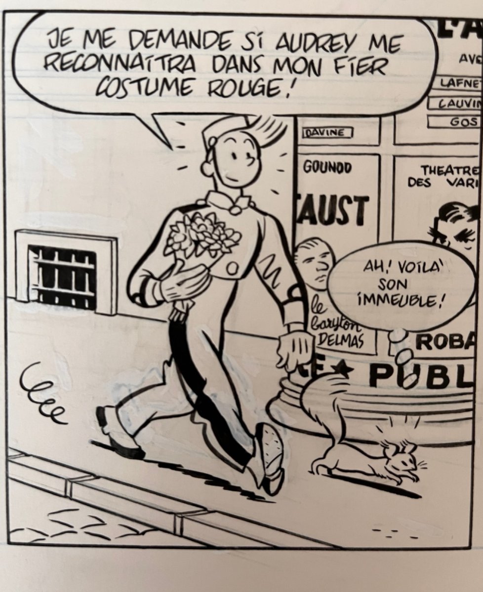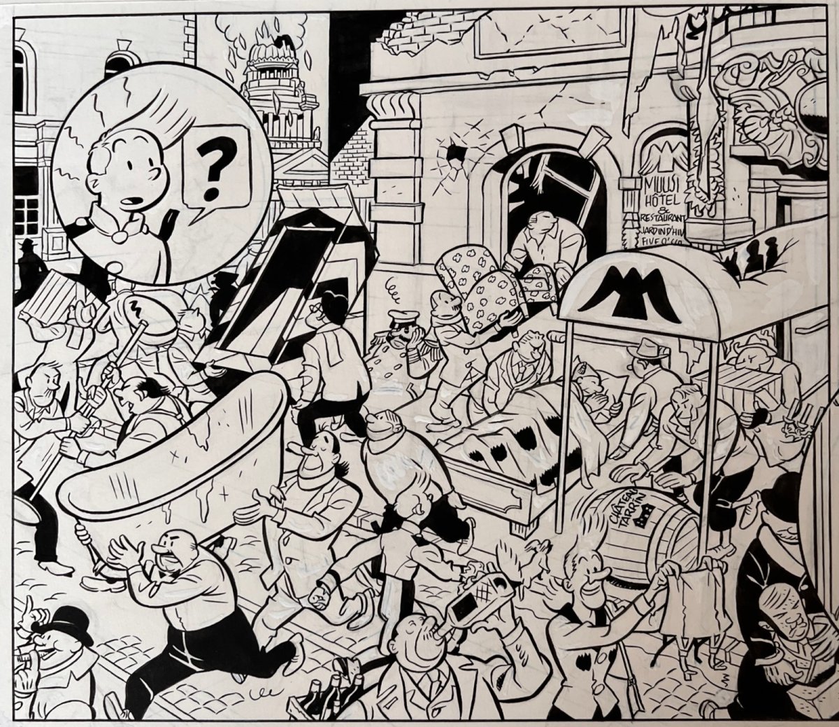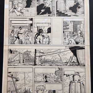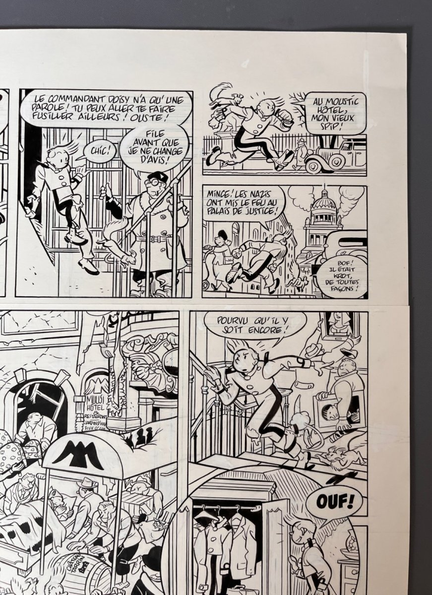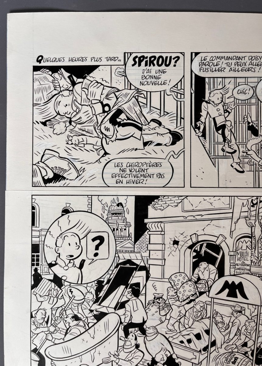 Superbe planche originale pour la page 60 de l’album de Spirou, le Groom Vert-de-gris – On notera la présence du Palais de Justice de Bruxelles et de personnages de Bob et Bobette dans les vignettes