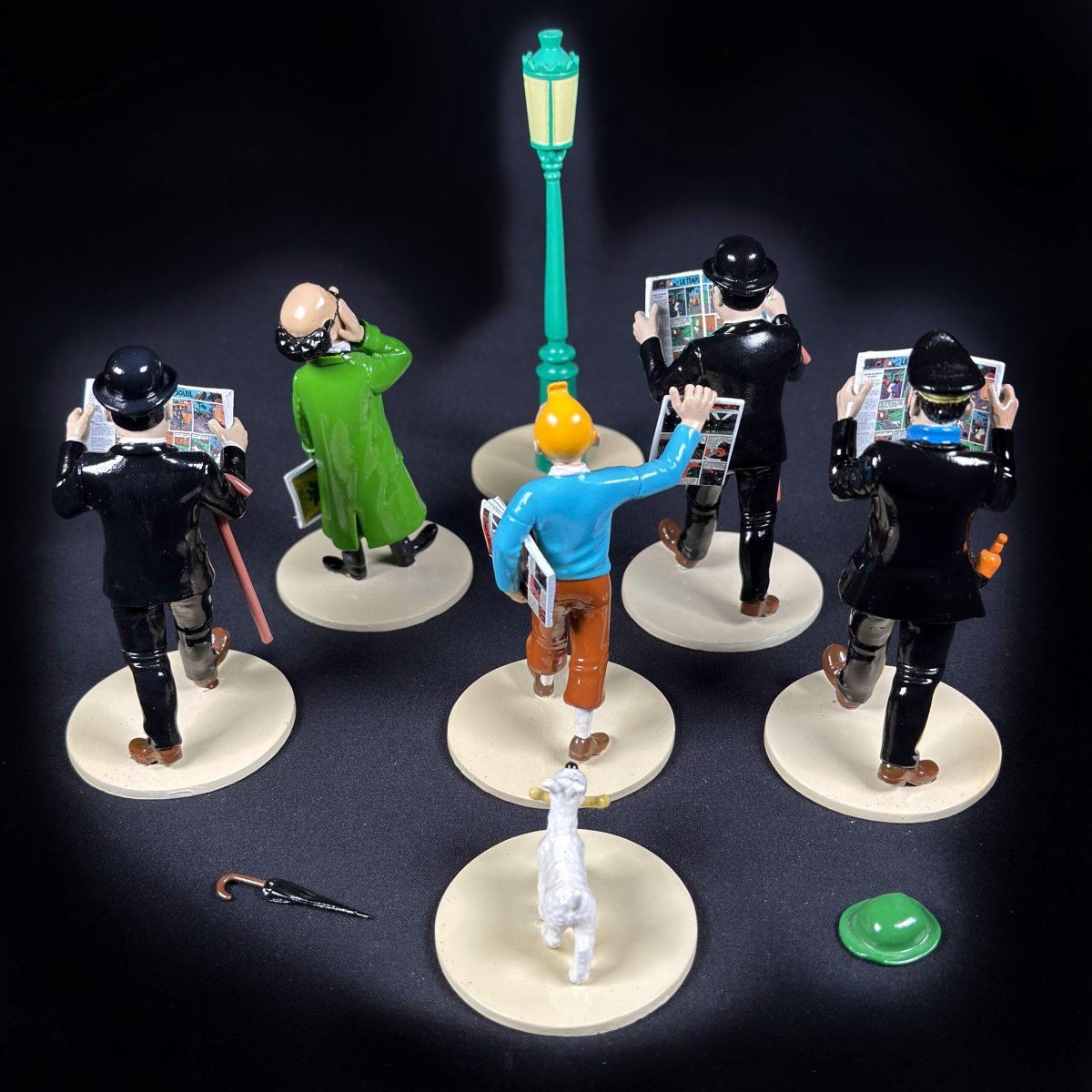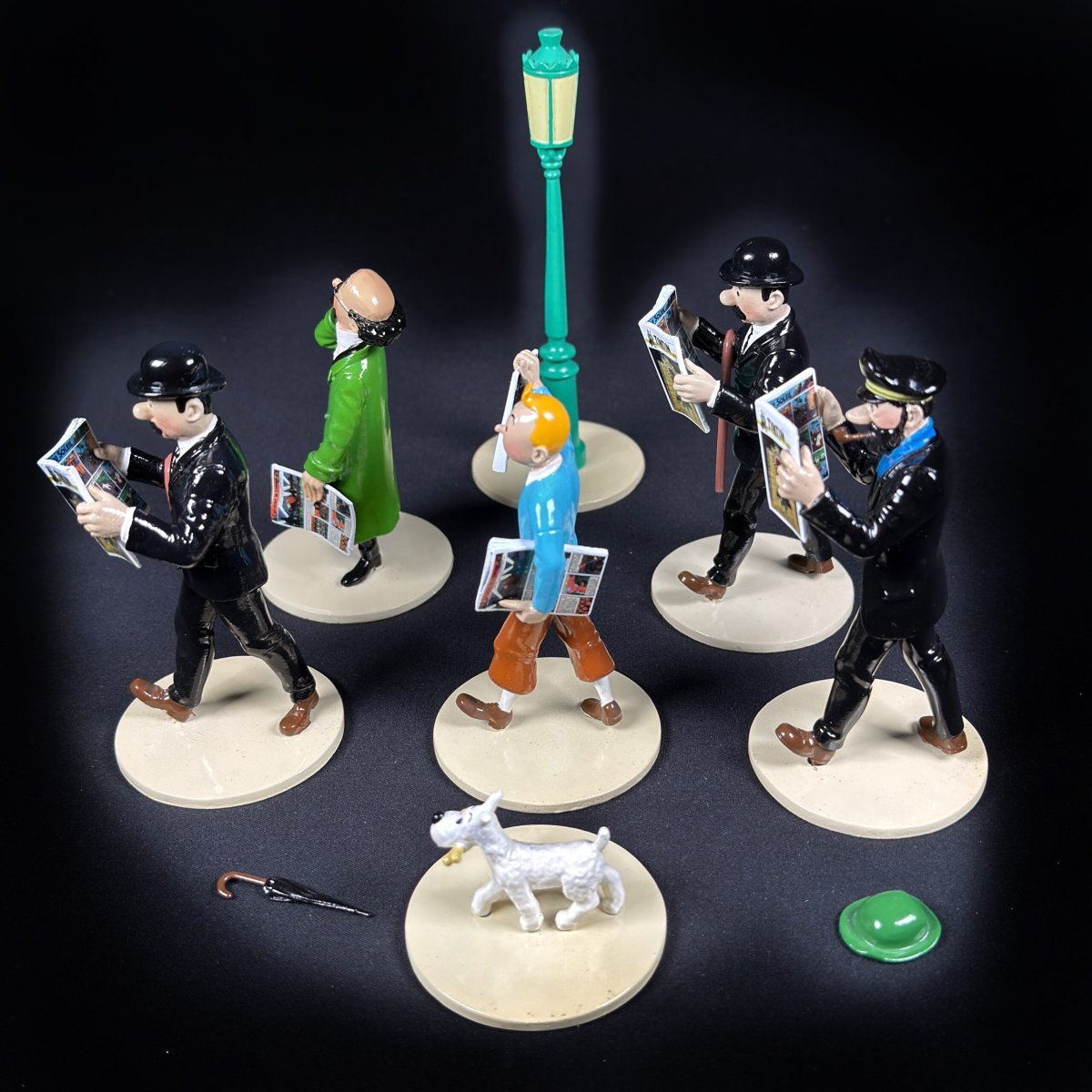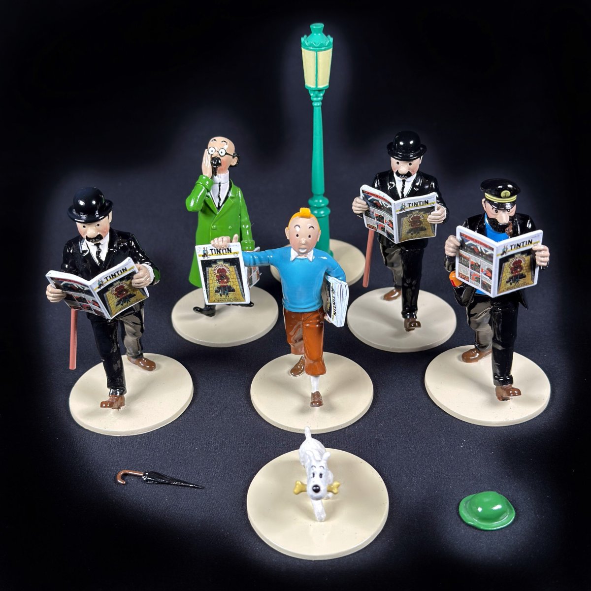 Ensemble de 6 figurines et accessoires en métal polychrome sculptées et réalisées à la main par Moulinsart.