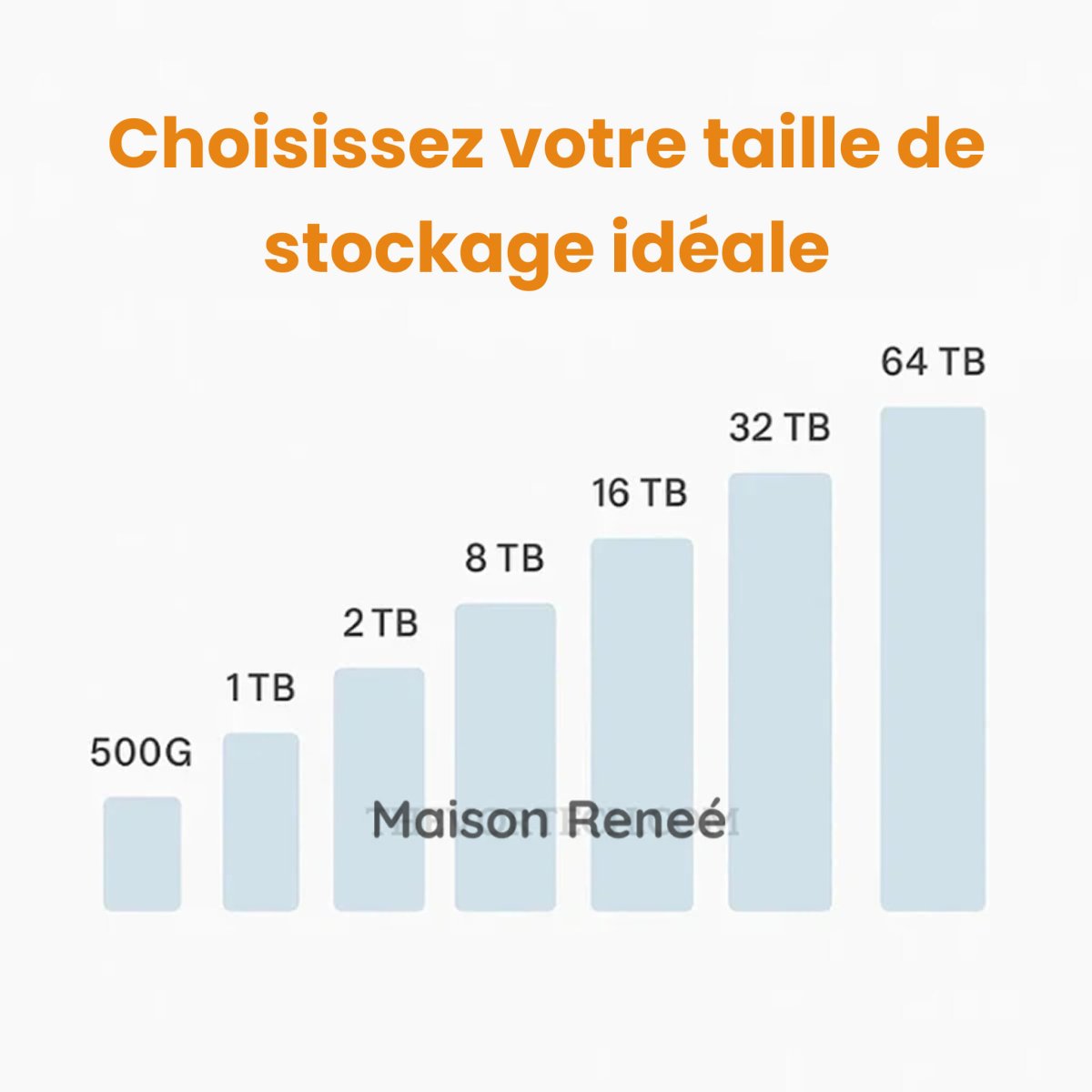 - Choisissez parmi plusieurs capacités de stockage : 1TB, 2TB, 4TB.