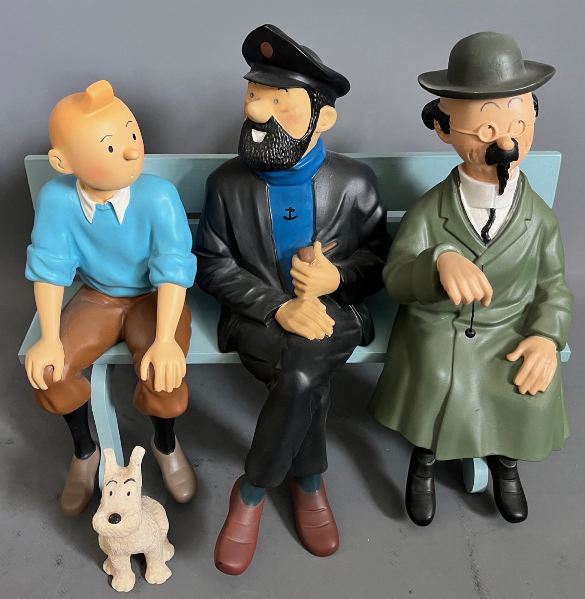 Sans boites d’origines (qui n’avaient pas de signes particuliers) – Hauteur des personnages: env. 30 cm et 10 cm pour Milou – Longueur du banc: 37 cm