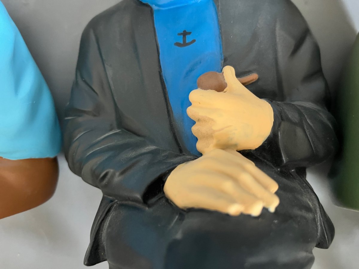 Très bel état – Un petit manque couleur sur la pointe de la chaussure de Haddock et sa main gauche a été repeinte – Quelques légères traces sur le banc où l’on assied les personnages (non visibles une fois les personnages assis)